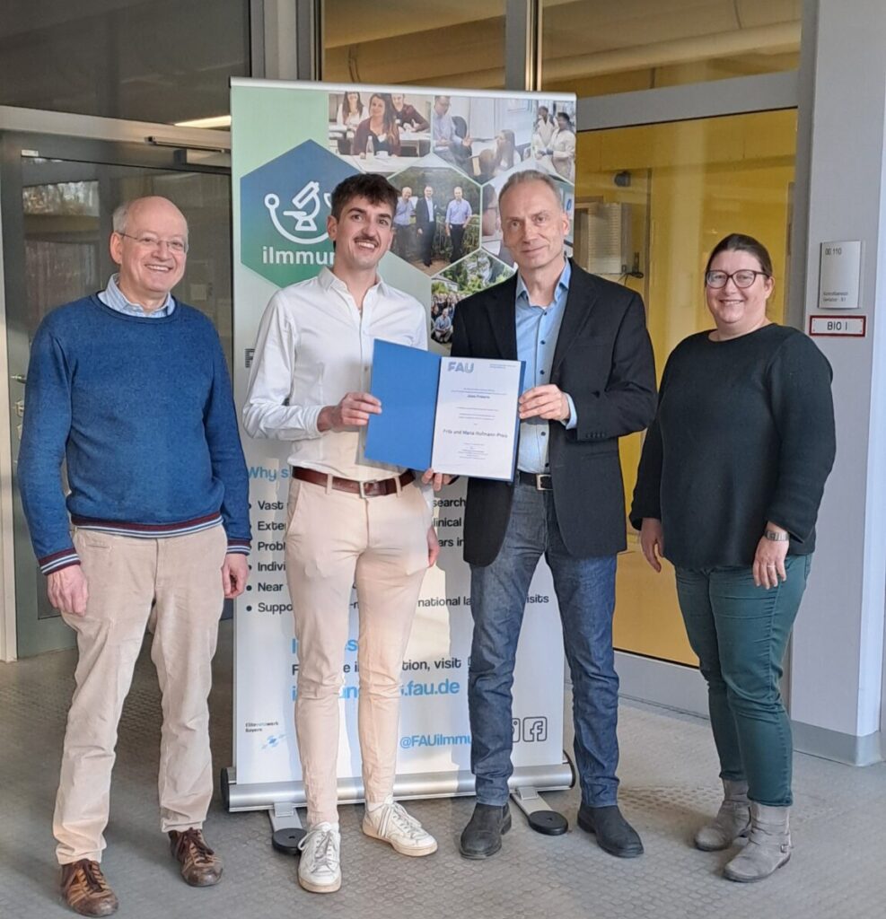 Prof. Lars Nitschke (chairmen of the exam baord), Prof. Falk Nimmerjahn (spokesperson of the program) , and Professor Anja Lux (Professor for Integarted Immunology) were honored to hand over the prize to Jonas, who wrote his master’s thesis titled Establishment of a two-dimensional barrier model for analysis of HTLV-1 transmission at the Harald-zur-Hausen Institute of Virology at the University Hospital Erlangen.