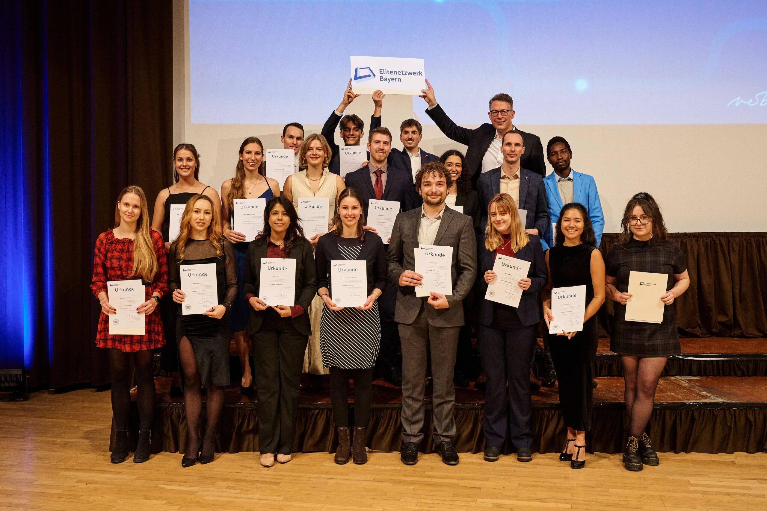 On November 25, 2025, the time had finally come. A new class of graduates was honored for their achievements by the Elite Network of Bavaria. This year, the graduation ceremony took place at the Heinrich-Lades-Halle in Erlangen. Eighteen of our 29 graduates attended and celebrated their graduation together with other graduates, relatives, friends, and program representatives. After a standing reception, the graduates were honored on stage by Markus Blume, Minister of State for Science and the Arts, and photos were taken together. Afterwards, everyone was able to round off the evening with delicious food, good conversation, and live music. Since the ceremony only takes place once a year, some graduates met again after a long time and were able to share their experiences.